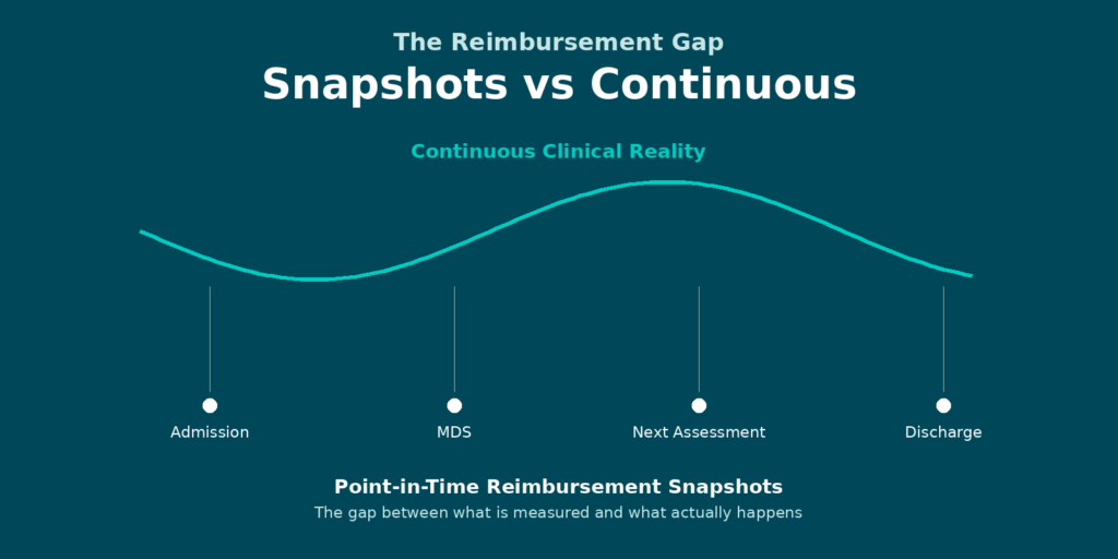 AI in SNF reimbursement showing the gap between point-in-time reimbursement and continuous clinical reality in skilled nursing